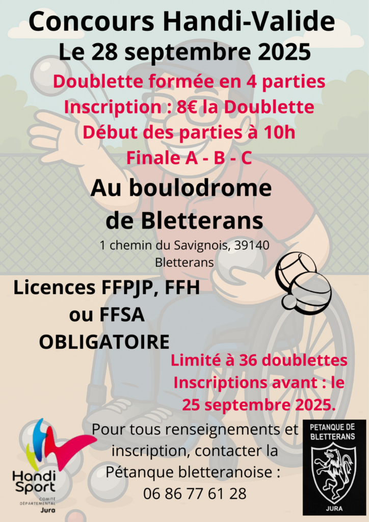 Concours handi-valide Post category:ÉVÈNEMENT Post published:19 septembre 2025 Dimanche 28 septembre 2025 concours handi-valide de pétanque organisé par la Pétanque Bletteranoise ! Read more articles Article précédentConcours Handi-pétanque